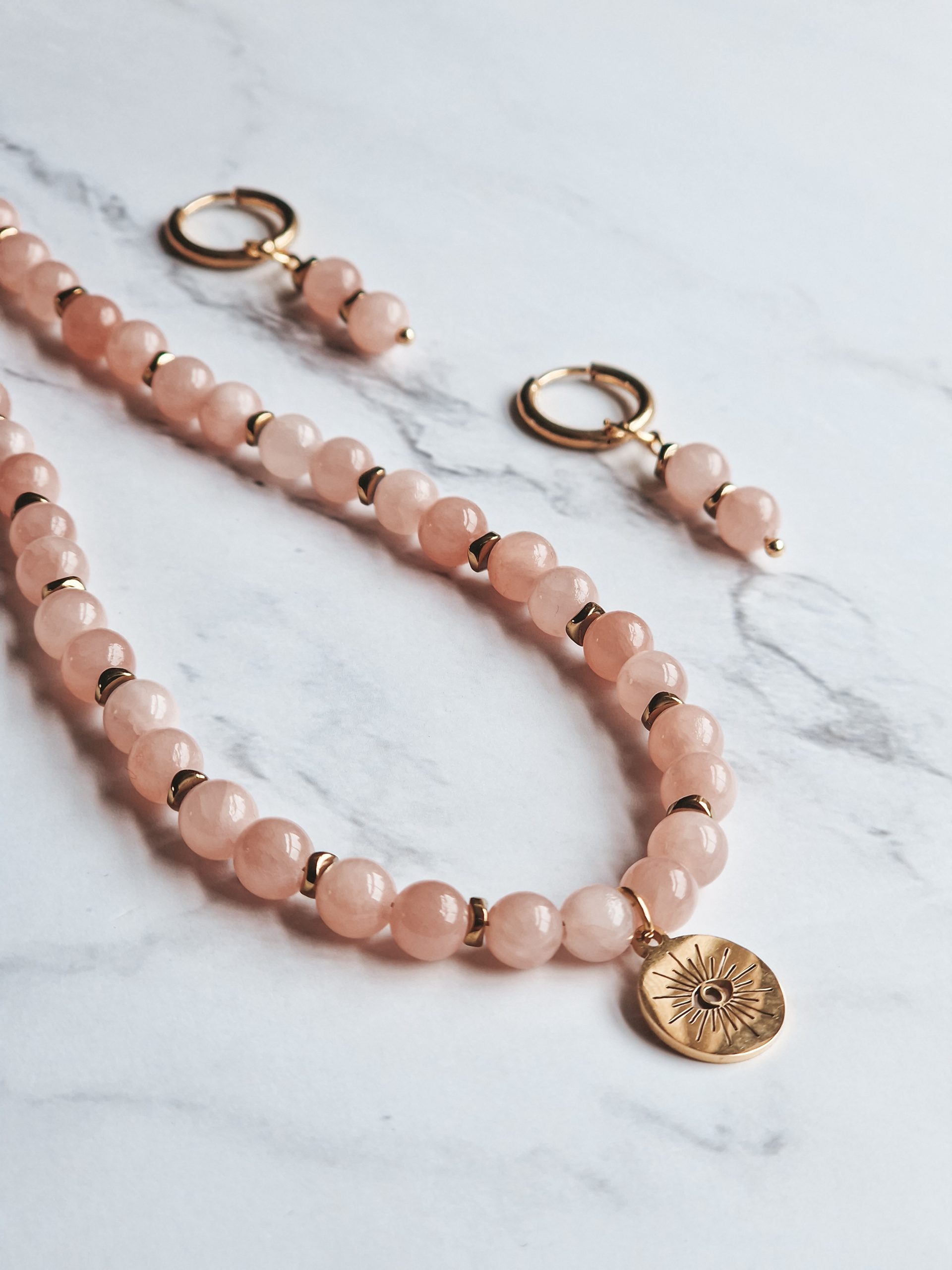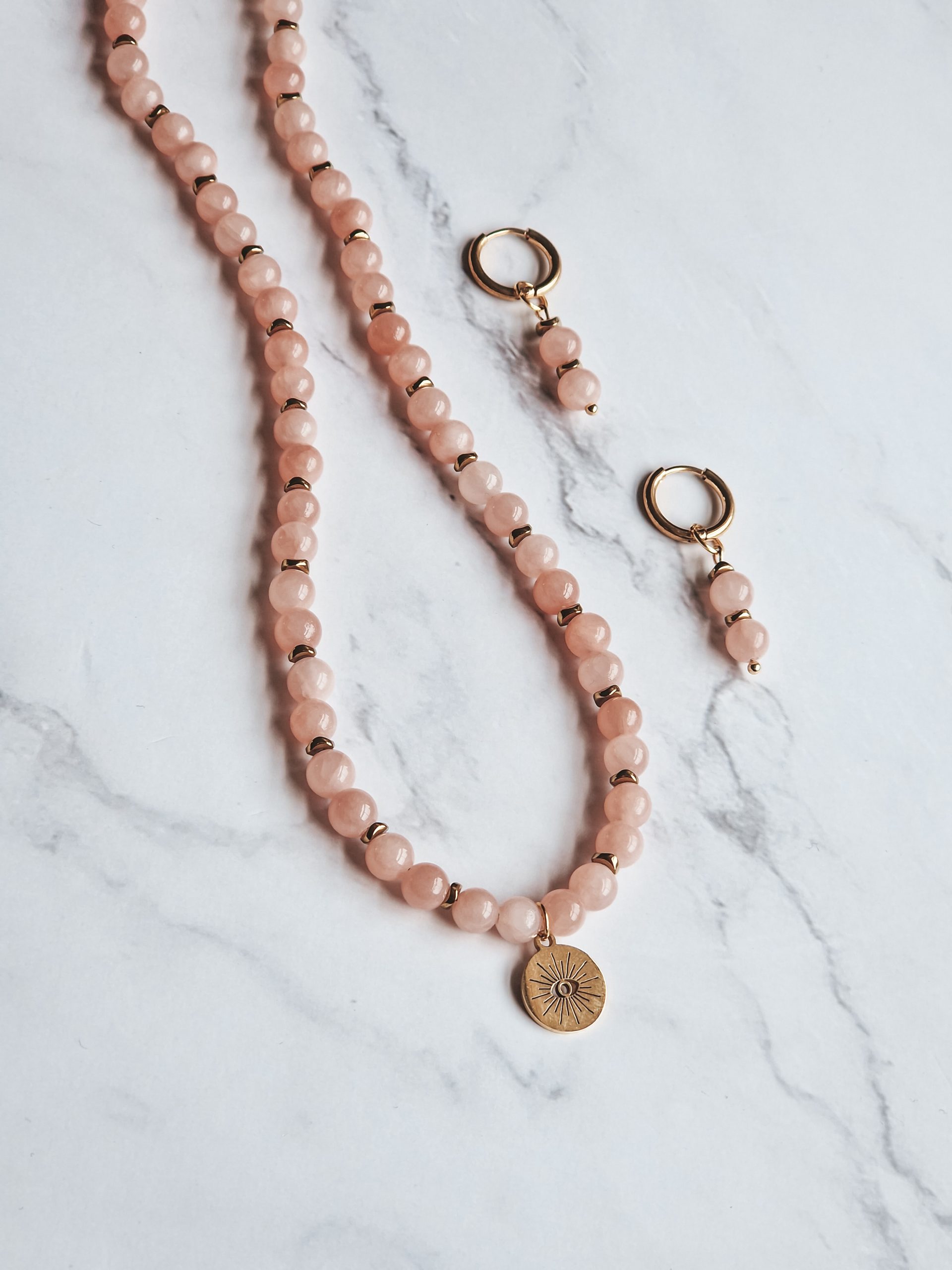 Pink jade Necklace with pendant and earrings set